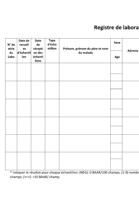 * Indiquer le résultat pour chaque échantillon: (NEG): 0 BAAR/100 champs; (1-9) nombre exact si 1 à 9 BAAR/100 champs; (+): 10-99 BAAR/100 champs; (++): 1-10 BAAR/