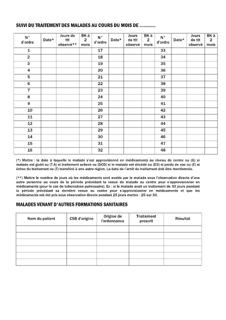 médicaments (pour le cas de tuberculose pulmonaire). Ex : si le malade avait un traitement de 30 jours pendant