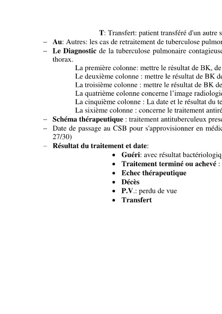 T: Transfert: patient transféré d'un autre service antituberculeux pour poursuivre son traitement
