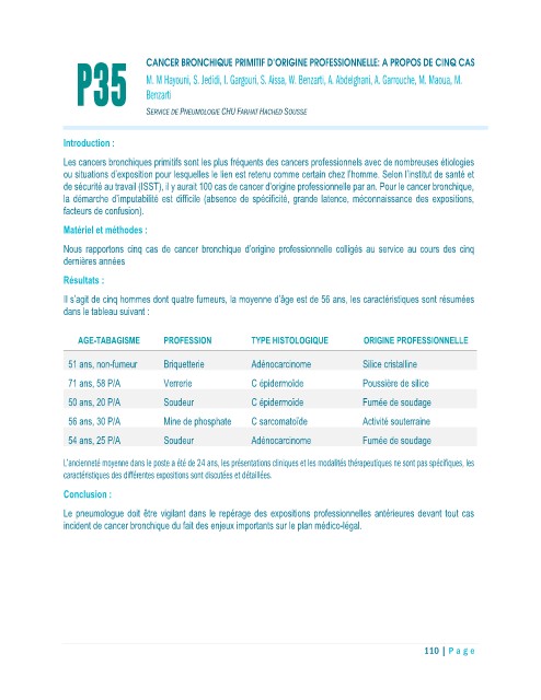 P35 CANCER BRONCHIQUE PRIMITIF D’ORIGINE PROFESSIONNELLE: A PROPOS DE CINQ CAS