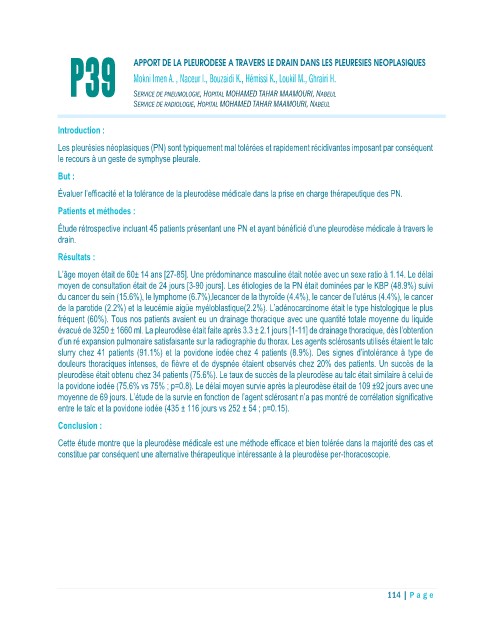 P39 APPORT DE LA PLEURODESE A TRAVERS LE DRAIN DANS LES PLEURESIES NEOPLASIQUES