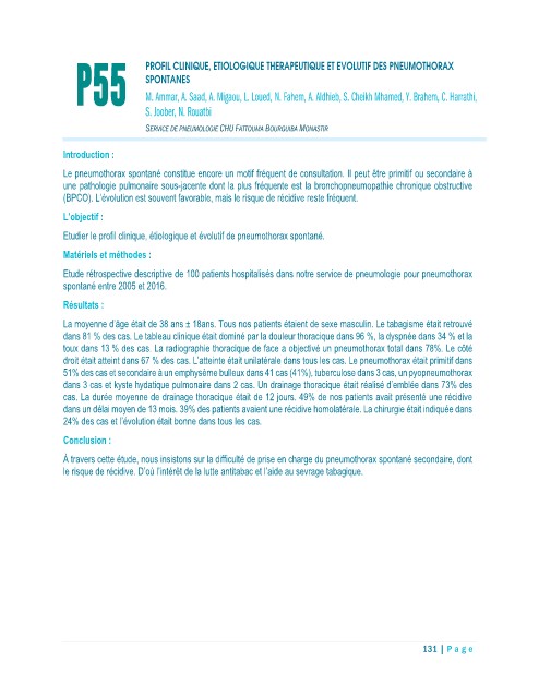 P55 PROFIL CLINIQUE, ETIOLOGIQUE THERAPEUTIQUE ET EVOLUTIF DES PNEUMOTHORAX
