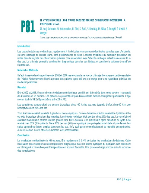 P81 LE KYSTE HYDATIQUE : UNE CAUSE RARE DES MASSES DU MEDIASTIN POSTERIEUR : A