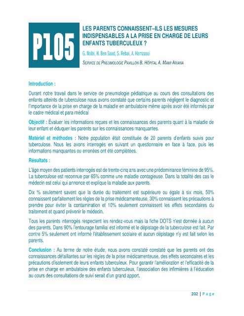 des parents. Dans 90% l'entourage familial est informé et le dépistage de la tuberculose est fait. Par