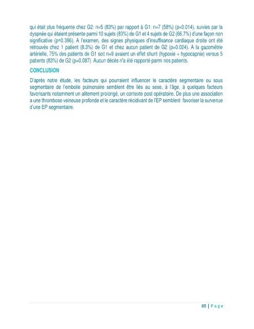 qui était plus fréquente chez G2: n=5 (83%) par rapport à G1: n=7 (58%) (p=0.014), suivies par la