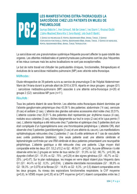 P62 Soumaya Debbiche 1, Imen Sahnoun1, Iteb Ben Limem 1, Ines Ghanmi 1, Khouloud Chaâbi