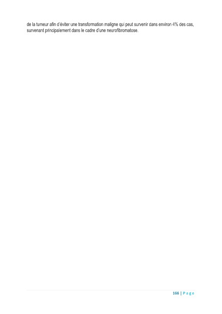 de la tumeur afin d’éviter une transformation maligne qui peut survenir dans environ 4% des cas, survenant principalement dans le cadre d’une neurofibromatose. 166 | Pa g e