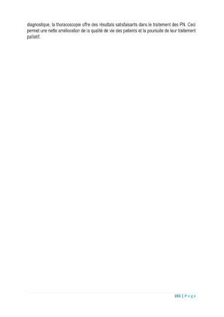 diagnostique, la thoracoscopie offre des résultats satisfaisants dans le traitement des PN. Ceci permet une nette amélioration de la qualité de vie des patients et la poursuite de leur traitement palliatif. 183 | Pa g e