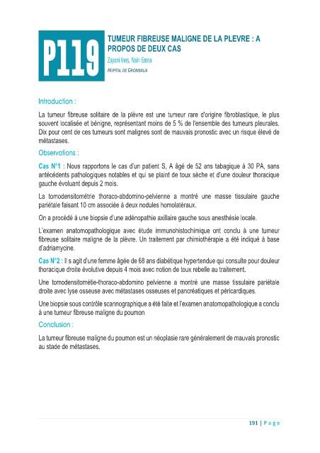 P119 TUMEUR FIBREUSE MALIGNE DE LA PLEVRE : A