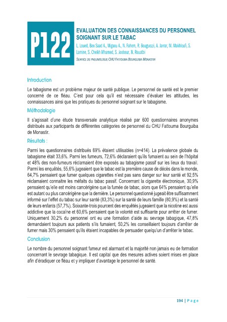 tabagisme était 33,6%. Parmi les fumeurs, 72,6% déclaraient qu’ils fumaient au sein de l’hôpital