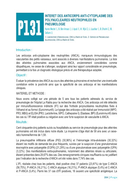 pneumologie de l’hôpital La Rabta pour la recherche des ANCA. Ces anticorps ont été détectés