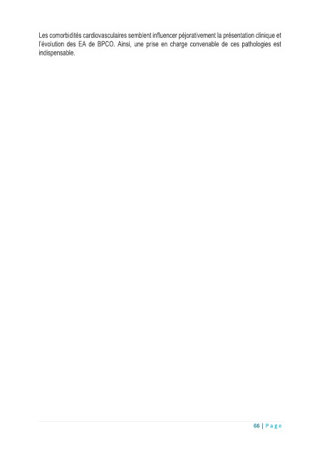 Les comorbidités cardiovasculaires semblent influencer péjorativement la présentation clinique et l’évolution des EA de BPCO. Ainsi, une prise en charge convenable de ces pathologies est indispensable. 66 | Pa g e